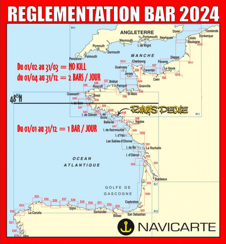 Au nord du 48e parallèle, la où la ressource est en état de reconstitution, 2 bars resteraient autorisés par jour et par pêcheur, avec interdiction de prélèvement en période de reproduction.